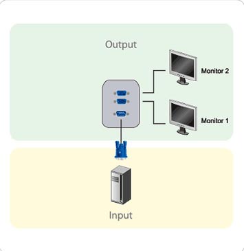 VS82視訊分享器可將任何來源(例如電腦)的視訊訊號複製輸出到2台顯示器裝置(螢幕和投影機等)。除了複製訊號輸出外,它們也能增強訊號以提供高達65公尺的連線距離。此外,使用者還能將多台視訊分享器堆疊串聯(最多三層)以擴充支援顯示裝置數量,並可合宜將這些視訊分享器掛置於牆上。